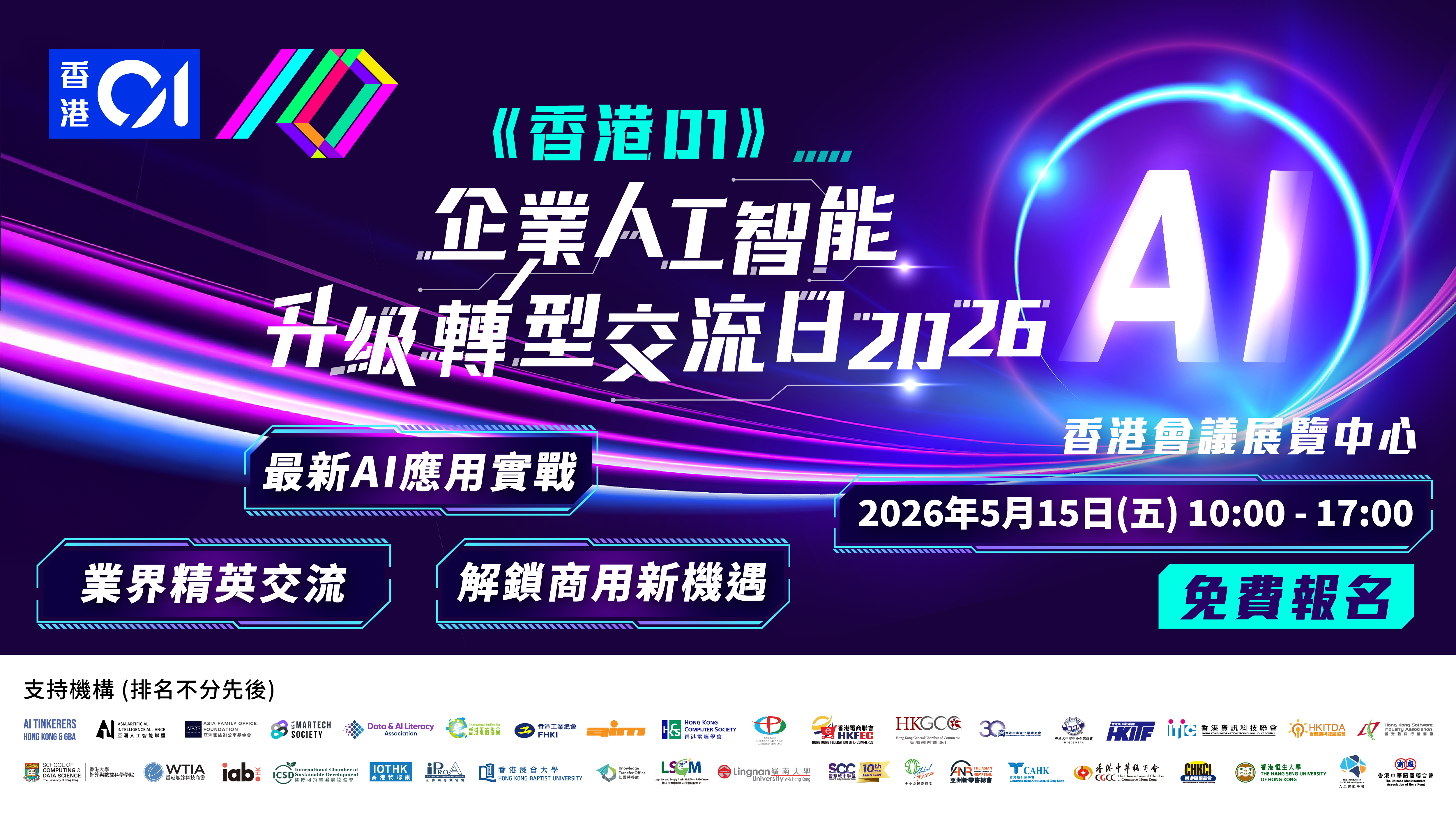 Date: May 15, 2026 (Friday) Time: 10:00 - 17:00 Venue: Hong Kong Convention and Exhibition Centre (HKCEC) Strategic Background: Building on last year’s success with 8,000+ participants, this summit brings together AI enterprises and practical use cases. Our goal is to help businesses overcome cost and talent barriers, achieving "industries for AI" and "AI for industries" to cement Hong Kong as a global AI hub. | |